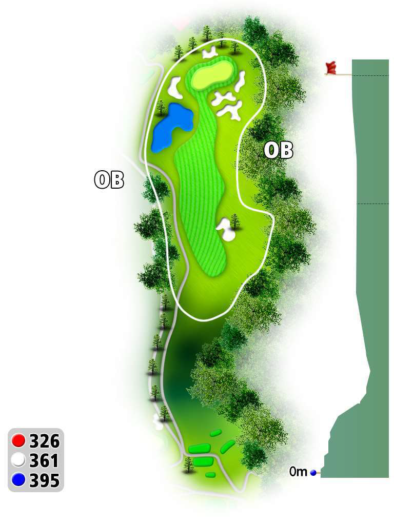グリーン手前、左に池、右手前にバンカーがあるので少し大きめに打っていく。BACK REGULAR LADIES 395 361 326 -